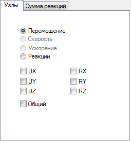 Узлы ![]() Опция Общий доступна только для выбора опции Перемещения. Опции Скорость и Ускорение доступны при исследовании динамических процессов во времени. Общее перемещение равно длине вектора перемещения – корню квадратному из суммы квадратов компонент перемещений. В нижней части диалогового окна пользователь может выбрать узел или группу узлов, в которых будут определяться значения выбранных для изображения на графиках функций. |