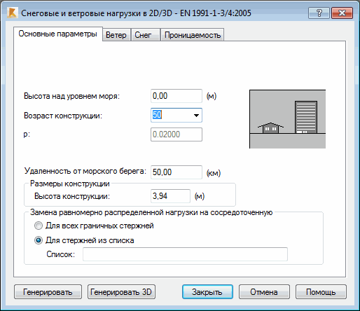 При переходе в диалоговом окне Снеговые/ветровые нагрузки на вкладку "Общие параметры" отображается следующее диалоговое окно: