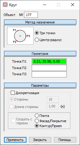 В диалоговом окне Геометрия расположены три поля редактирования. Здесь вводятся координаты точек P1, P2 и P3. Значения этих точек зависят от выбранного метода, определяющего окружность.