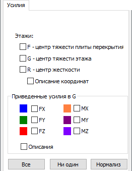 В этом диалоговом окне могут быть выбраны для показа приведенные усилия (Fx, Fy, Fz Mx, My, Mz); эти силы и моменты приведены к центру тяжести каждого этажа для данного случая. Для каждого из значений выше, могут быть выбраны соответствующий цвет и описание (значения сил).
