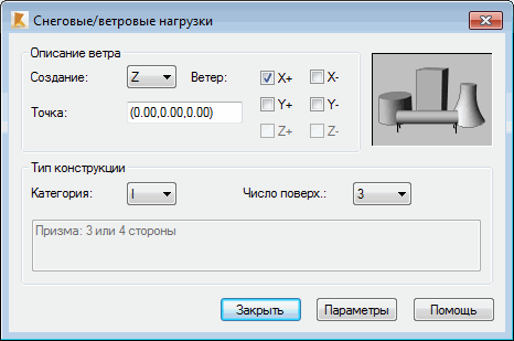 Опция позволяет создавать ветровые нагрузки, действующие на выбранные плоские конечные элементы и на плиты. Это означает, что прежде чем применить эту опцию необходимо выбрать плиты или конечные элементы, для которых будет создаваться ветровая нагрузка.