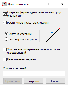 «Растянутые стержни» и «Сжатые стержни». В поле, которое расположено в нижней части диалогового окна, можно задать следующие стержни (графически или путем ввода номеров): стержни ферм, стержни, работающие только на растяжение или только на сжатие, стержни, для которых необходимо учитывать влияние поперечных сил при расчете деформацией конструкции.