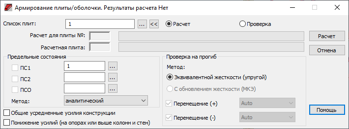 - расчеты выполняются только для панелей с номерами, указанными в поле Список панелей и для вариантов и вариантов сочетаний указанных в полях ULS, SLS, ACC.