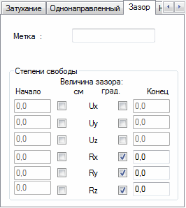 Определение опоры с зазором состоит в назначении имени опоры, выборе фиксированной опоры или указании степеней свободы в начале и конце элемента, ввода значений допустимых перемещенй или поворотов для направлений снятия связей. Если направление фиксировано, смещение равно нулю.