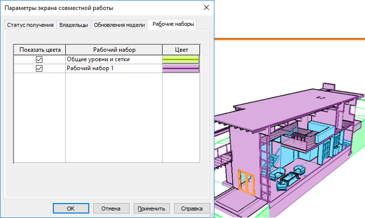 "Параметры экрана совместной работы". В модели отображается указанный цвет для соответствующего рабочего набора.