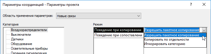 Предположим, что сначала был задан режим «Игнорировать категорию», а затем потребовалось скопировать этот тип приборов в модель MEP. Для этого необходимо определить параметры координации для модели MEP или для конкретной связанной модели. В противном случае приборы из связанных моделей, относящиеся к данной категории, в программе не распознаются.