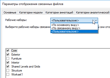Перейдите на вкладку "Рабочие наборы" диалогового окна "Параметры отображения связанных файлов" для главной модели. На этой вкладке можно выбрать конкретные рабочие наборы для отображения на виде главной модели.