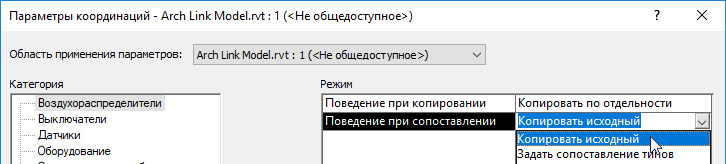 Перед копированием приборов из связанной модели в модель MEP или непосредственно в процессе копирования следует задать в диалоговом окне «Определение параметров координации» режим сопоставления для каждой категории приборов.