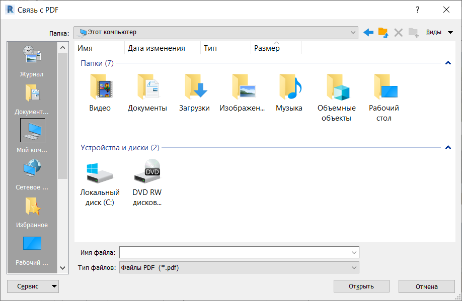 Инструменты «Связь с PDF» и «Связь с изображением» доступны на вкладке «Вставка» панели инструментов Revit. После нажатия кнопки «Связь с PDF» и «Связь с изображением» отображается диалоговое окно для выбора нужного файла PDF или изображения.