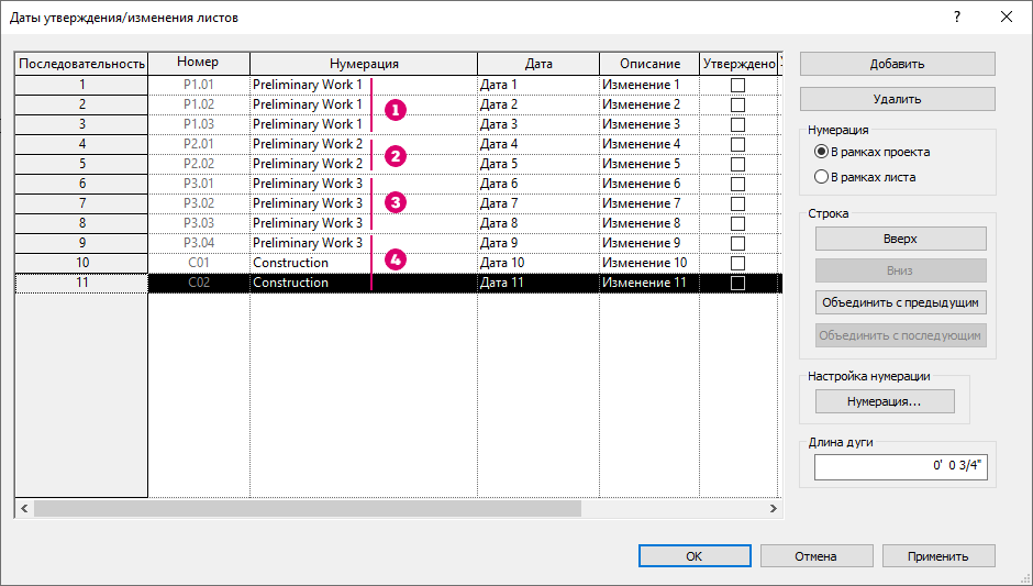 На изображении показан процесс создания описанной схемы нумерации изменений в Revit. На каждом этапе предварительного проектирования создается числовая последовательность: , и . В номерах числовой последовательности используется две цифры и префикс (P1, P2 и P3 соответственно). В последовательности нумерации изменений, используемой на этапе строительства (), номера состоят из двух цифр и префикса (C).