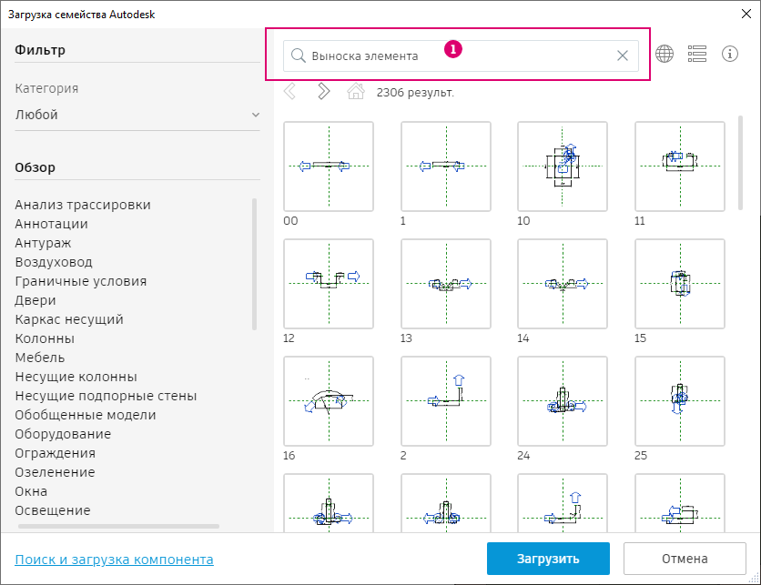 Когда нужное семейство найдено, его можно загрузить в проект. Для этого выберите семейство в обозревателе семейств и нажмите кнопку «Загрузить» в нижней части окна. Выбранное семейство загружается в активную модель Revit, и обозреватель закрывается. Для загрузки другого семейства повторите эту процедуру.