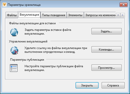 На вкладке "Визуализация" диалогового окна "Параметры хранилища" содержатся параметры для настройки вставленных файлов визуализации, управления ими и настройки параметров публикации.