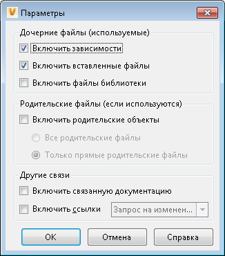Можно указать, будет ли операция хранилища затрагивать только дочерние или только родительские файлы выбранного файла или же все связанные с ним файлы. В версии Vault Professional можно также настроить применение операции к связанным объектам.