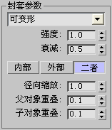 “内部”、“外部”以及“二者”按钮决定了后面介绍的控件(径向缩放、父对象重叠和子对象重叠)是否应用于封套的内部边界、外部边界,还是同时应用于内外边界。首先,点击按钮选择要调整的边界,然后在微调器中更改值。