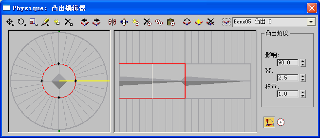 关节到达所需的角度时,网格会凸出。默认情况下,如果是首次与网格相连,则 Physique 将会创建一个凸出角度。因此,为了制作旋转 Biped 关节时凸出的手臂或腿部,只能创建和设置一个附加凸出角度。