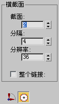 通过更改“分辨率”设置,可以增加或减小分辨率。该控件位于“凸出”子对象的“凸出”卷展栏中。但是,“横截面”视图始终显示的是 36 分辨率线。