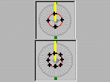 亮黄色半径指出“截面”视图中显示的“切片”方向。“截面”视图始终显示的是“横截面”视图的垂直截面。这个垂直截面是用该视图顶部和底部的绿点表示的,它正好位于包含分辨率线的圆周之外。默认情况下,方向栏位于时钟三点的位置。通过拖动方向栏的一端(光标更改为微型横截面),可以更改“截面”视图的方向。为此,可以在“截面”视图中查看凸出的不同角度。
