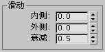 “蒙皮滑动”参数控制在关节旋转时,产生的蒙皮滑动程度。在无蒙皮滑动的情况下,最接近于关节的顶点倾向于向里压缩和往外延展,一般表现在网格段。向外滑动促使围绕关节的顶点向关节移动,避免侧面上大于 180 度的局部化延伸。向里滑动促使顶点松散并且滑离关节,避免侧面上小于 180 度角的顶点收缩在一起。
