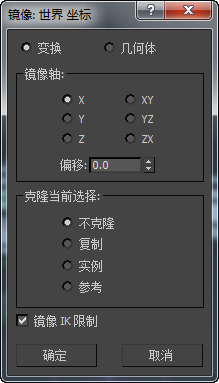 “镜像”工具还可以用于围绕当前坐标系中心镜像当前选择。使用“镜像”对话框可以同时创建克隆对象。如果镜像分级链接,则可使用镜像 IK 限制的选项。