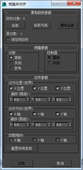 将克隆生成为永久对象。单击“应用”后,可以使用“克隆并对齐”来生成附加的克隆,如果愿意的话可以将前一克隆的结果用作源或目标对象。