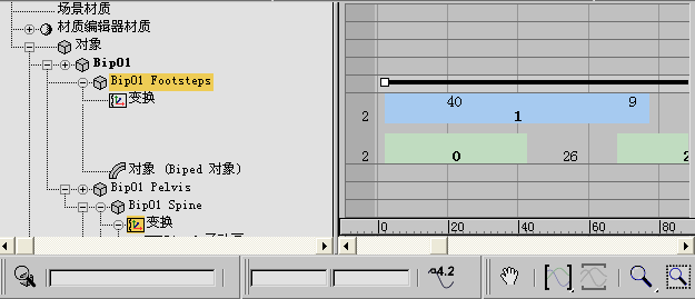 在视口中,足迹代表 Biped 脚部在空间中的支撑周期。可以在视口中移动和旋转足迹。在轨迹视图中,每一足迹显示为一块,代表 Biped 的脚部在时间上的支撑周期。在轨迹试图中,可以适时地移动足迹。在视口中,足迹的位置和方向控制 Biped 步幅的位置。