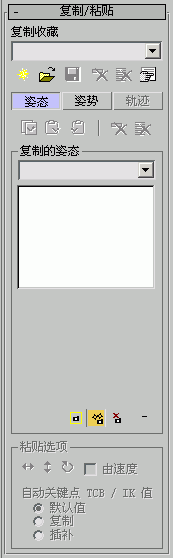 “运动”面板上的复制/粘贴卷展栏提供复制和粘贴两足动物姿势、姿态与轨迹的控件。姿势是任何选定 Biped 对象的旋转和位置。姿势是某特定 Biped 中所有对象的旋转和位置。轨迹是任何选定 Biped 部位的动画。有关使用轨迹的信息,请参见复制和粘贴轨迹。