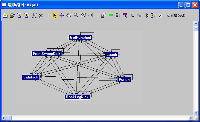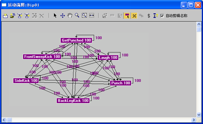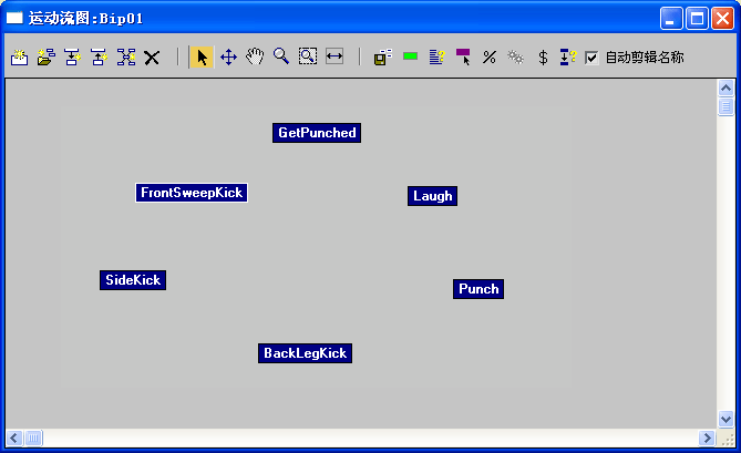 共享运动流可以将运动流指定给多个 Biped 或群组。不必为每个 Biped 建立剪辑的运动流网络,可以创建具有所有剪辑和变换的运动流来制作多个 Biped 动画。创建随机运动将使用每个 Biped 自己的运动流。如果某 Biped 的运动流恰好是共享运动流,那么将会使用共享运动流来计算随机运动。