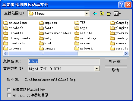 注: 如果在当前会话过程中想搜索引用的 BIP 文件,但是不想向 biped.ini 文件添加目录,则启用“添加待搜索的目录”。