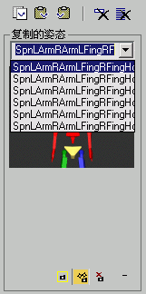 在 character studio 中,可以针对以下三个模式之一保存多个复制/粘贴缓冲区:“姿态”、“姿势”和“轨迹”。它们在“复制的姿势”/“复制的姿态”/“复制的轨迹”下拉列表中是可用的;“粘贴”按钮使用的活动缓冲区的名称可以在列表顶部看到。缩略图视图是已保存活动缓冲区的预览。