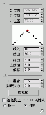 “手臂”。 复制的值信息将传输到这个新的关键点。关键点值中“缓入/缓出”现在为 10 和 50,TCB 为 5,“IK 混合”为 0.5。长方体仍为“IK 对象”,“对象空间”仍保持选中状态。还要注意,手是唯一设置关键点的肢体。
