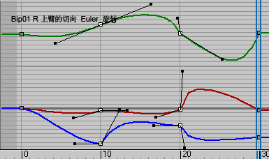 Euler 旋转轨迹的 XYZ 功能曲线是锁定在一起的。这意味着在一个轴上创建一个新的关键点将自动在所有轴上创建关键点。而且,在时间轴上移动一个关键点将带动所有的三个轴。