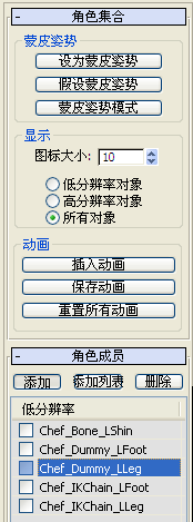 - 所有角色集合的成员都显示在该列表中。默认情况下,所有成员都将指定为“高分辨率”对象。要将某个成员指定为“低分辨率”,请在列表中选中该对象。“高分辨率”和“低分辨率”指定与“角色集合”卷展栏中的“显示”组选项一起使用。