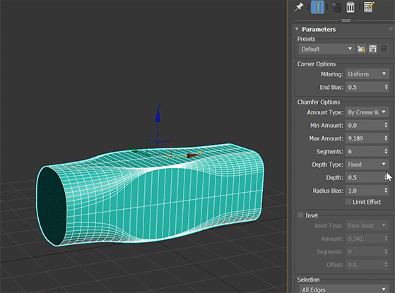 - 按权重:使用来自网格的通道数据来驱动切角。可以在“可编辑多边形”或“编辑多边形”修改器的“边属性”中设置深度权重。