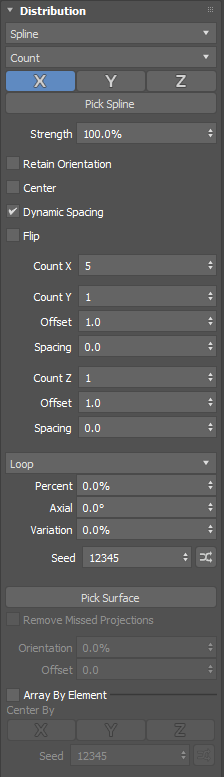 - 默认菜单:进行选择 >“Modifiers”菜单 >“Parametric Deformers”>“Array”>“Distribution”卷展栏 >“Spline”