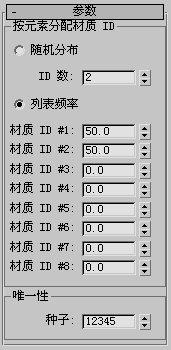 该组中有两种选择,既可以创建完全随机的材质 ID 分布,也可以根据设置的百分比在多达八种材质中划分指定。