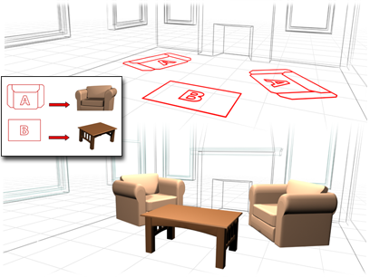 通常,设计者会在 AutoCAD 设计中使用二维图形来表示对象,诸如家具。然而,当他们将 DWG 文件链接到 3ds Max 用于可视显示时,他们希望查看设计中对象的外观。