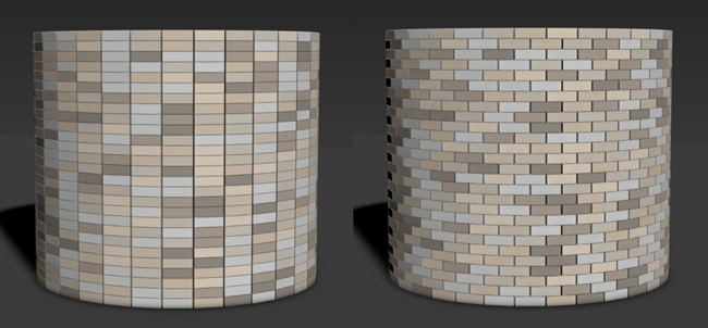 参数将每行砖块旋转单个砖块宽度的一半,从而创建连续砌合图案。下图显示了