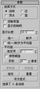“编辑法线”修改器主要用于子对象层级,法线,只要将该修改器应用于对象,此层级在默认情况下都处于活动状态。此时,在“修改”面板上,可看到网格顶点发出的线条状的法线、选择和变换法线、复制和粘贴法线以及更改法线设置。