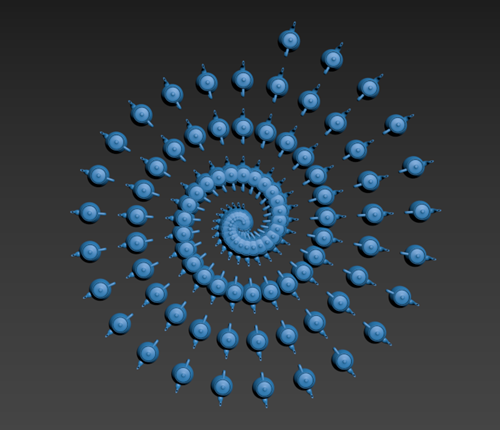 - 沿阵列的主轴连续和切向(朝向/背离)移动每个克隆。这可用于生成螺旋阵列。在以下示例中,“Radial”设置为 0.3。