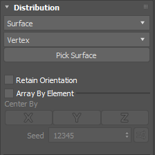 - 默认菜单:进行选择 >“Modifiers”菜单 >“Parametric Deformers”>“Array”>“Distribution”卷展栏 >“Surface”