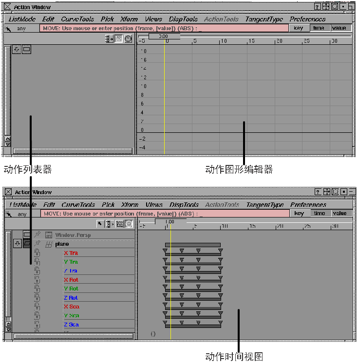可以通过在动作列表器中选择动画参数的名称,在图形编辑器中拾取通道和动画曲线。