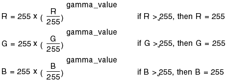 根据下列公式,对每个颜色通道 (RGB) 应用“Gamma Correction”值 (gamma_value):