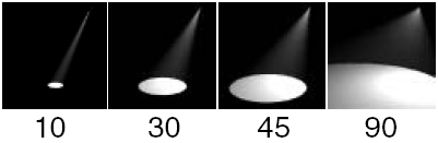 从聚光灯光束的边到边的角度(以度为单位)。当“Spread”值大于 170 时可能会发生分辨率问题;小对象可能不会投射阴影。有效/滑块范围是 2 到 179。默认值是 90。