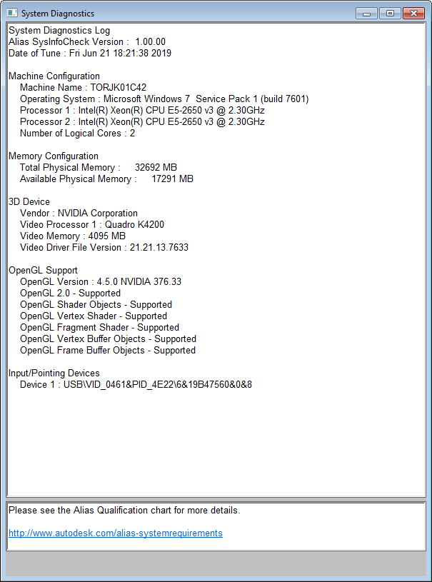 “System Diagnostic”窗口显示有关当前硬件和驱动程序(操作系统、CPU、显卡、tablet、3D 外围设备)的信息。此功能仅在 Windows 版的 Alias 中可用。单击窗口底部的链接可查看 Alias 限定表。