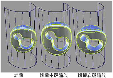 使用“Scale”模式可相对于终点调整目标的大小,将接触点用作缩放轴心点。 同样,如果缩放的目标延伸出终点,则该工具将沿切线方向推断。使用鼠标左键可按等比缩放(单击并左右拖动)目标。使用鼠标中键可沿终点曲面缩放(使目标变大而不变厚);使用鼠标右键可缩放目标的厚度。