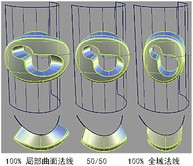 “Conform Control”选项窗口中有一个“Parallel normal mode”滑块。 如果值为 0.0(如下一屏幕快照中左侧对象所示),则使用终点局部法线的 100%。值为 1.0(如屏幕快照的右侧所示)意味着将全局使用在目标中心建立的终点法线。结果是目标侧面都显示为平行,并因此得名。该滑块的默认值为 1.0。还可以使用该滑块过渡两种效果(屏幕快照中间的对象使用 0.5):