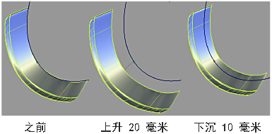 使用“Elevate”模式可选择将目标升高并远离终点,或使目标降低并沉入该曲面。 可通过在“Elevate”模式下单击并上下拖动来执行此操作。还可以使用当前线性单位,以绝对坐标模式或相对坐标模式键入仰角值。