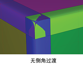 禁用此选项时,既不会修剪也不会过渡角点,圆角保持不变。这样,您就可以让边圆角保留非过渡状态,以后可以使用其他工具(例如“Corner Blend”工具)获得所需的形状。(请参见创建倒角过渡曲面)。默认情况下“Corner Blend”处于启用状态。