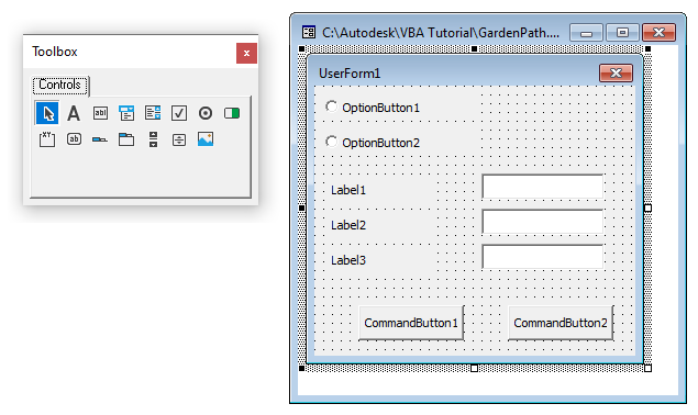 A UserForm object is used to represent a dialog box in a VBA project. After a UserForm object has been added to a project, you can use the tools on the Toolbox window to add controls to and select controls on a UserForm object. Once a control tool is clicked, click and drag over the UserForm object to size and position the control. Controls on a UserForm object can be a text box, drop-down list, radio optional buttons, and command buttons among many others. Command buttons are typically used to represent the OK and Cancel buttons of a dialog box.