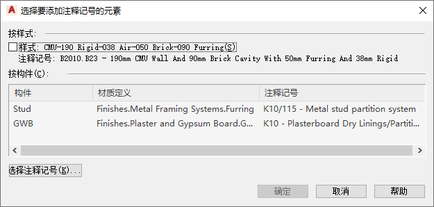 显示“选择要添加注释记号的元素”对话框。 - 如果要给一个对象构件添加注释记号,请在“构件”列中选择它,然后单击“确定”。